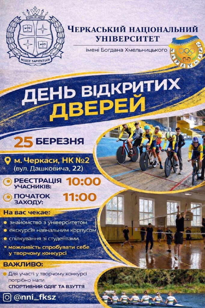 Приходь, щоб дізнатися більше про навчання, студентське життя та спортивні можливості. Буде цікаво, активно і по-справжньому атмосферно!